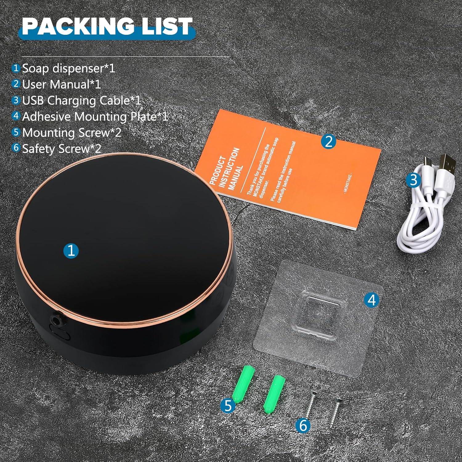 Soap dispenser * 1, USB charging cable * 1, manual * 1, adhesive * 1.